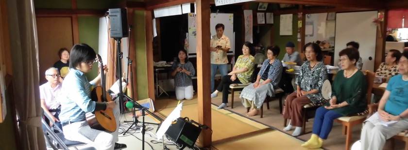 カフェでは午後のお別れ時に皆で「ふるさと」を手話の勉強を兼ねて、合唱していましたが、いつの間にかピアノ、ハーモニカ、ウクレレ、オカリナが加わるようになり、大変に賑やかになりました。これは利用者さんとボランティアの皆さんが各自で楽器を持ち寄られたもので、皆さんなかなかの特技をお持ちのようです。みんな素人ですので、間違って演奏したりもしますが、楽しい時間を過ごしています。太鼓に挑戦して「三池炭鉱節」を習っている人もいます。元気です。